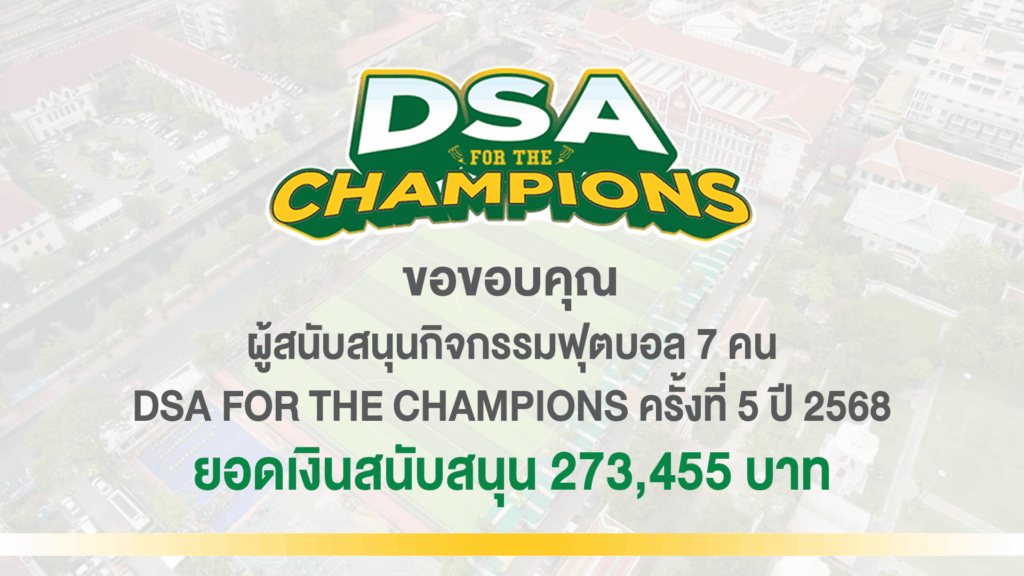 สมาคมนักเรียนเก่าเทพศิรินทร์ฯ ขอแสดงความขอบคุณอย่างจริงใจ แด่พี่น้องเทพศิรินทร์ทุกกลุ่ม ทุกรุ่น ที่ร่วมแรงร่วมใจสนับสนุน กองทุน DSA for the Champions จากกิจกรรมการแข่งขันฟุตบอล 7 คน DSA for the Champions ครั้งที่ 5 รวมยอดสมทบทุนทั้งสิ้น 273,455 บาท รายได้ทั้งหมดถูกนำไปใช้เพื่อสนับสนุนและพัฒนาศักยภาพของนักกีฬาเทพศิรินทร์อย่างเต็มที่ ขอบคุณสำหรับพลังแห่งน้ำใจและความรักของพี่น้องลูกแม่รำเพย และจะเป็นกำลังใจให้นักกีฬาตั้งใจฝึกซ้อม และแข่งขันด้วยความมุ่งมั่น เพื่อสร้างชื่อเสียงให้กับโรงเรียนของเรา สัญญาจะนำชัยมาให้แม่รำเพย