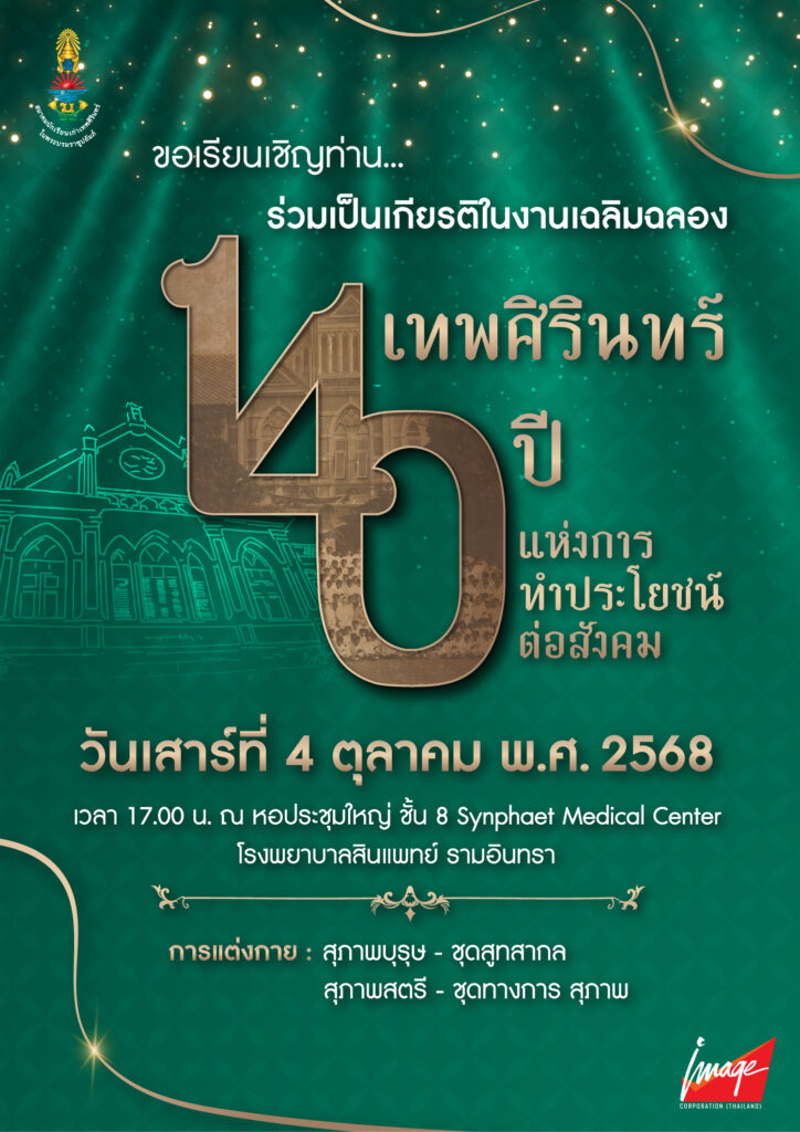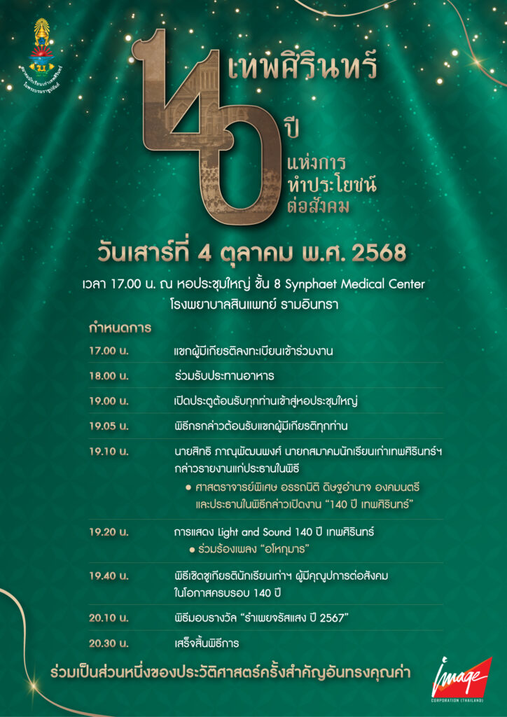 สมาคมนักเรียนเก่าเทพศิรินทร์ ในพระบรมราชูปถัมภ์ จัดงานเฉลิมฉลอง “140 ปี เทพศิรินทร์ แห่งการทำประโยชน์ต่อสังคม” วันเสาร์ที่ 4 ตุลาคม พ.ศ.2568 เวลา 17.00 น. ณ ห้องประชุมใหญ่ ชั้น 8 Synphaet Medical Center โรงพยาบาลสินแพทย์ รามอินทรา